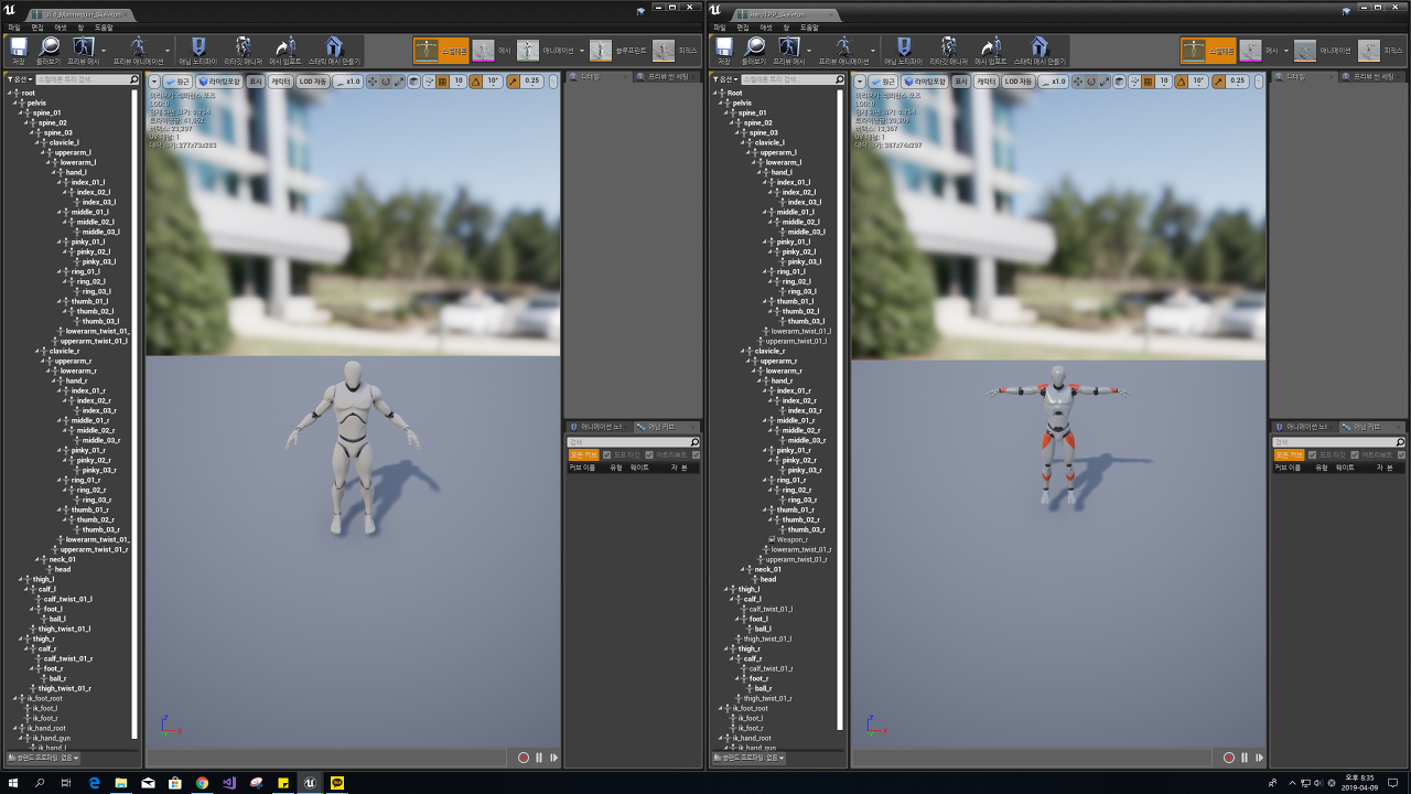 이후 애니메이션파일을 우클릭하여 '애님 애셋 리타깃 > 애님 애셋 복제후 리타깃'하면, 호환되는 스켈레톤을 선택할 수 있고, 그 스켈레톤에 애니메이션이 리타깃되어 해당 스켈레톤에 애니메이션이 제대로 적용되는것을 볼 수 있다.