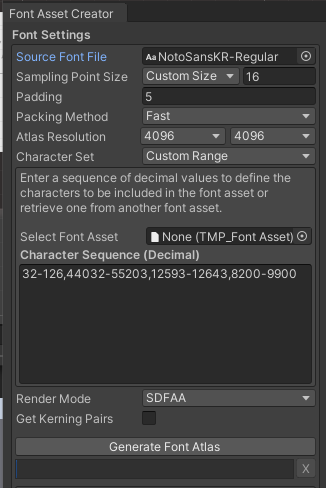 Character Sequence 에 입력 : 32-126,44032-55203,12593-12643,8200-9900